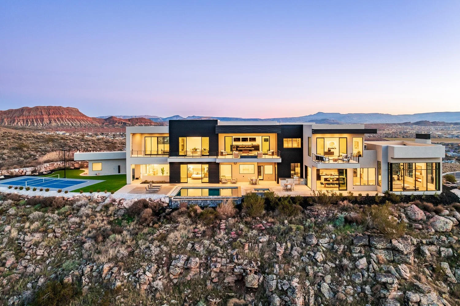 Set atop a private mountain just outside of St. George, Utah, this breathtakingly modern masterpiece was expertly designed to capture some of the most spectacular 360 degree views in the state. Nestled on an impressive 27 acres, this residence can only be accessed through a private road with an entrance at the base of Nichols Peak, or via helicopter as the property has the only approved private landing pad in the area. The interior of the home features a thoughtfully designed floor plan that creates an effortless flow between plentiful indoor and outdoor entertaining spaces. Tucked away from the main living areas, four well-appointed bedrooms feature stunning views and spacious private decks ideal for relaxation. The property’s ideal layout ensures comfort and privacy while entertaining, relaxing or enjoying the benefits of multigenerational living. Along with a spacious pool and spa and awe-inspiring views, the estate offers additional space to lounge, dine al fresco or enjoy additional amenities on the property. The surrounding grounds are home to a pickleball court, putting green and a par 3 hole, water feature and a beautiful outdoor kitchen. With over 300 days of sun, southern Utah provides the perfect backdrop to enjoy not only the on-property amenities, but plentiful nearby recreation opportunities including golf, boating and water sports, hiking, biking, motor sports, climbing and fishing. The location of this property transcends the ordinary; it's an estate that defines the art of luxury living while offering immediate access to the surrounding city and the St. George airport. From its unparalleled views to its wealth of luxurious amenities and meticulously designed spaces, this property stands as a true once-in-a-lifetime architectural masterpiece for a lifestyle that is truly unique.